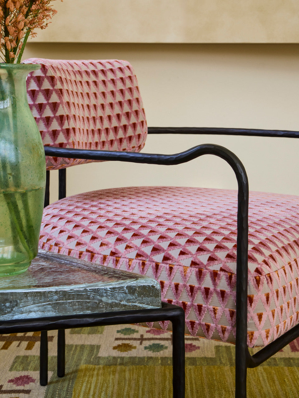Familiar swooping lines and enveloping upholstery are conceived and fabricated in a novel materiality and scale. The solid bronze C Back Lounge chair, with waterfall seat and back cushion, evoke classicism and craft. The bronze frame is hand-textured and patinated. Each is unique.